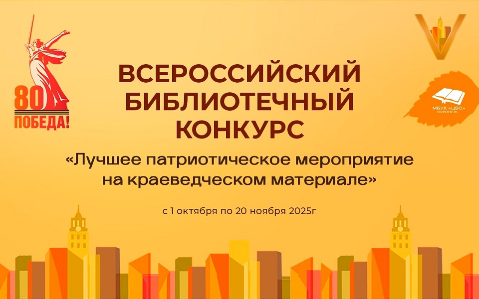 «Централизованная библиотечная система» г. Воронежа объявляет конкурс среди библиотек Российской Федерации на лучшее краеведческое мероприятие, посвященное 80-летию Победы в Великой Отечественной войне 1941–1945 годов.