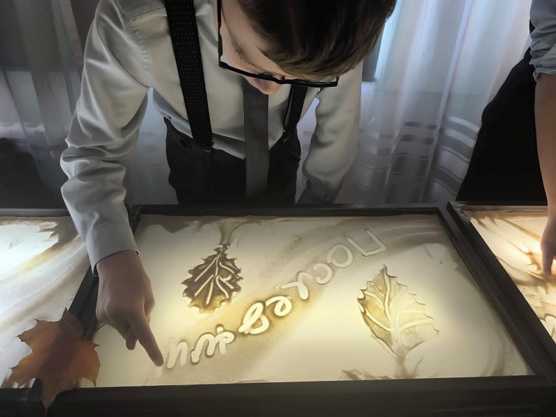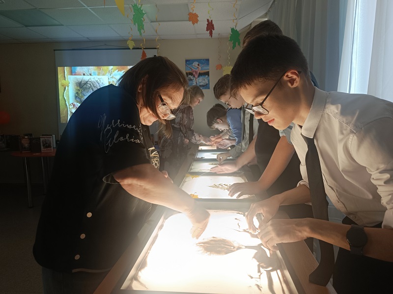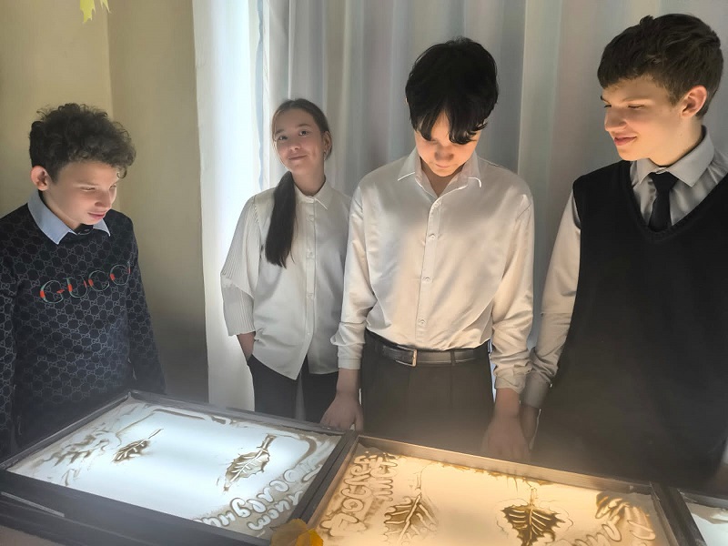 В конце мероприятия ребята прослушали песню Светланы Копыловой «Последний лист» и сделали красочные зарисовки на песочных столах.