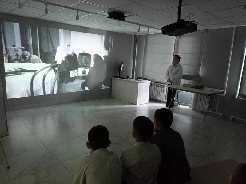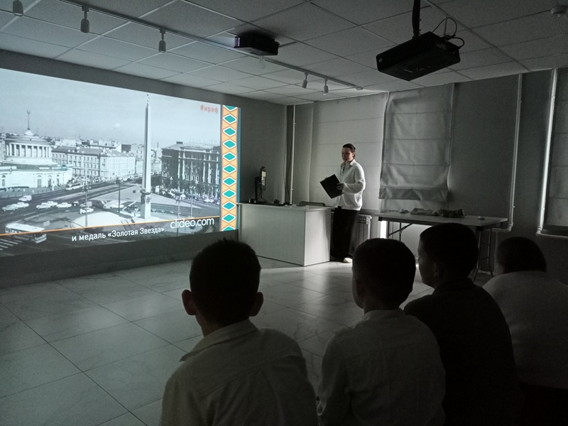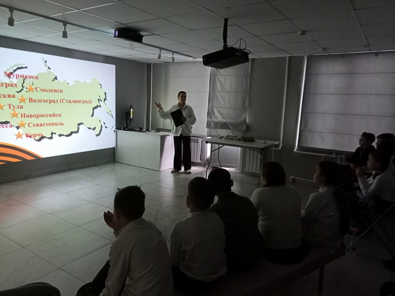 В ходе встречи ребята услышали рассказ о стойкости защитников и самоотверженности горожан городов-героев, таких как Москва, Ленинград, Киев, Севастополь, Волгоград, Тула и многих других, посмотрели кадры кинохроник тех лет.