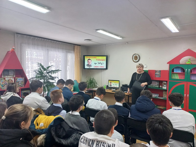 Затем внимание шестиклассников было обращено на творчество Аркадия Гайдара. Ребятам рассказали о произведениях писателя, которые стали классикой детской отечественной литературы. На произведениях этого автора выросло не одно поколение читателей.