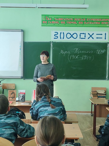 В рамках мероприятий, посвященных 120-летию со дня рождения поэта, 12 февраля библиотека-филиал №1 провела литературный урок «Эзе калды җиребездә, сүзе калды күңелебездә». Библиотекарь рассказала о непростой биографии поэта, о его творчестве, просмотрели и обсудили документальный фильм о поэте-герое. Познакомились с его стихами из «Моабитской тетради», написанными в застенках военной тюрьмы в Берлине. С трепетом и волнением присутствующие на мероприятии слушали стихи «Счастье», «Прощай, моя умница», «След», «Палачу», «Варварство» и др. Героические строки непокорённого поэта, которого не сломили вражеские застенки, актуальны и сегодня. Они призывают людей помнить о тех, кто погиб, и о тех, кто отстоял мир.