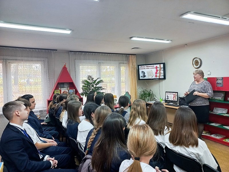 Сотрудники библиотеки познакомили восьмиклассников с фронтовой судьбой поэтессы, рассказали о том, каким образом сложилась ее послевоенная жизнь. Юлию Друнину по праву называют женским голосом фронтовой поэзии. Участники мероприятия имели возможность прослушать стихи поэтессы «Я только раз видала рукопашный», «Зинка», «Я ушла из детства в грязную теплушку» и другие. А также школьники послушали песни на стихи поэтессы «Комбат», «На кургане», «Ты рядом…».