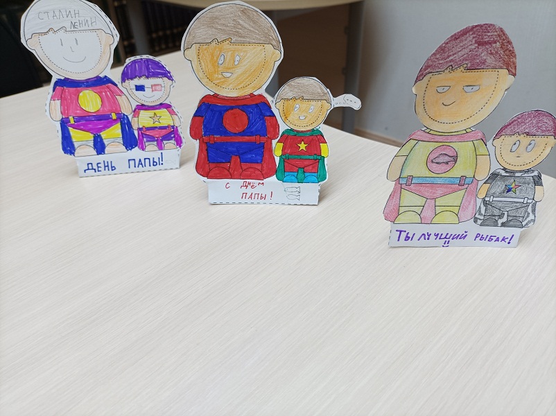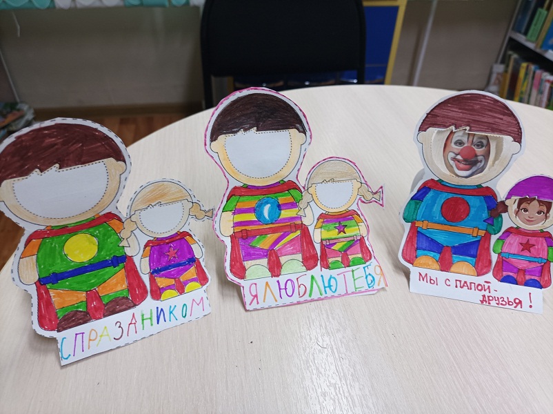 Участники мастер-класса прослушали информацию о традициях и истории Дня отца в России и изготовили открытку-коллаж, в которую кто-то вклеит фотографии папы и себя дома, а кто-то просто нарисовал лицо.  Открытка выполнена на твердой белой бумаге, костюмы героев раскрашены яркими красками. Каждый участник придумал фразу и подписал открытку папе. Такая работа украсит рабочий стол отца или интерьер любого помещения.