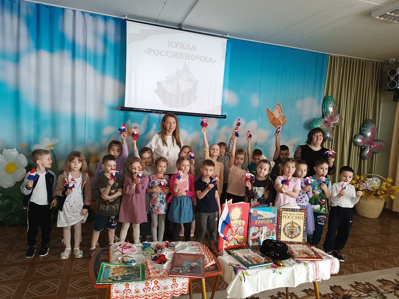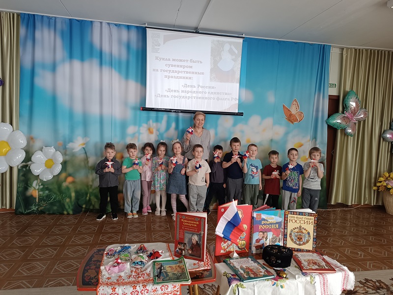А еще познакомились с символикой России: послушали гимн, узнали об истоках герба и значении цветов российского флага. В завершение мальчишки и девчонки с большим удовольствием изготовили куклу-сувенир «Россияночка», одежда которой состояла из цветов российского флага. А сама она символизирует образ России-Матушки. Такая кукла станет отличным сувениром и талисманом, наполненным теплом и уютом родного дома.