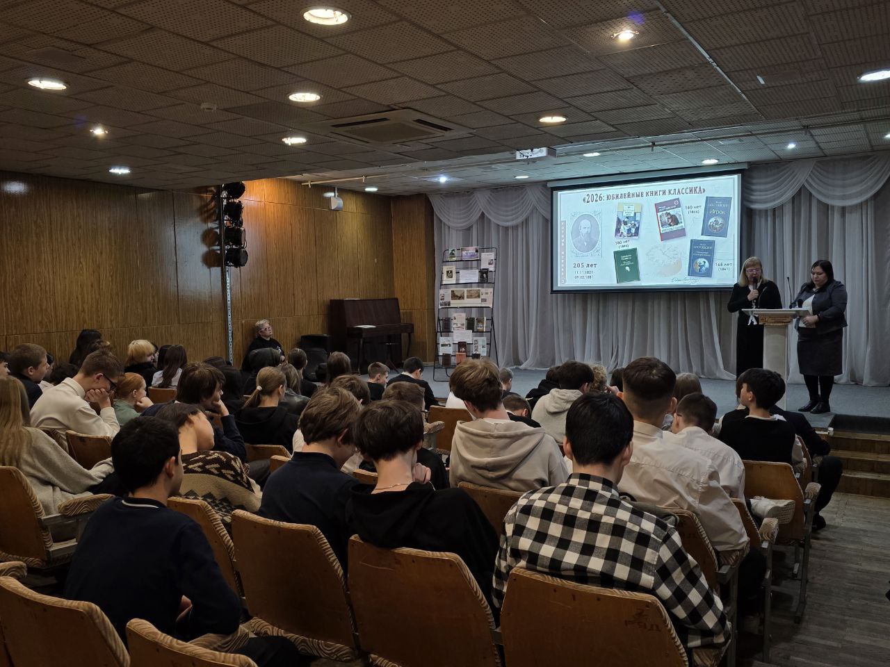 Видеоролики, отрывки из документальных и художественных фильмов сделали мероприятие насыщенным и содержательным, а книжная выставка «В ряду великих имён» стала важным элементом встречи.