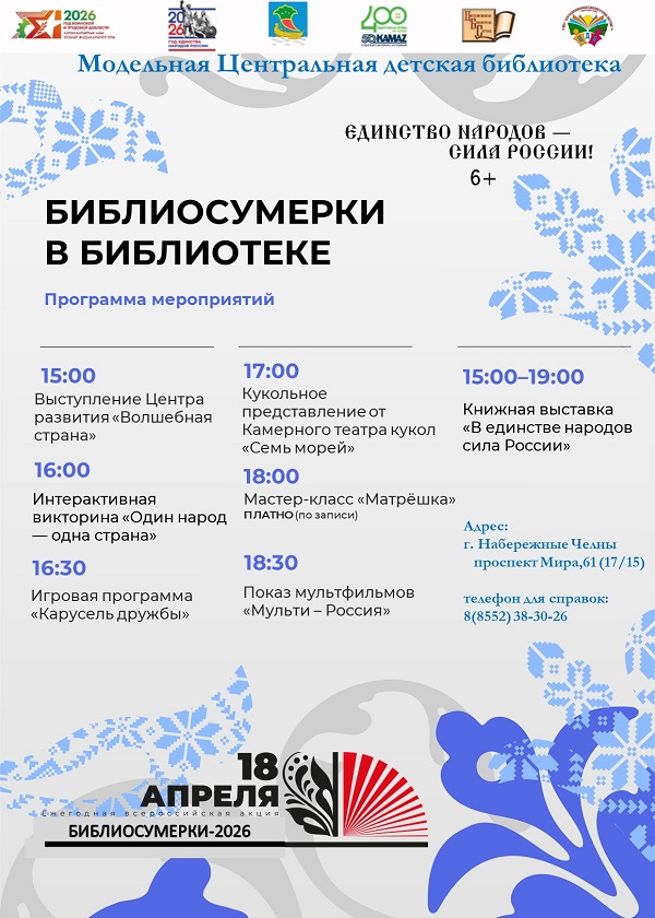 18 апреля 2026 года, Модельная центральная детская библиотека приглашает всех желающих на праздник дружбы, творчества и взаимного уважения — Библиосумерки «Единство народов — сила России!».