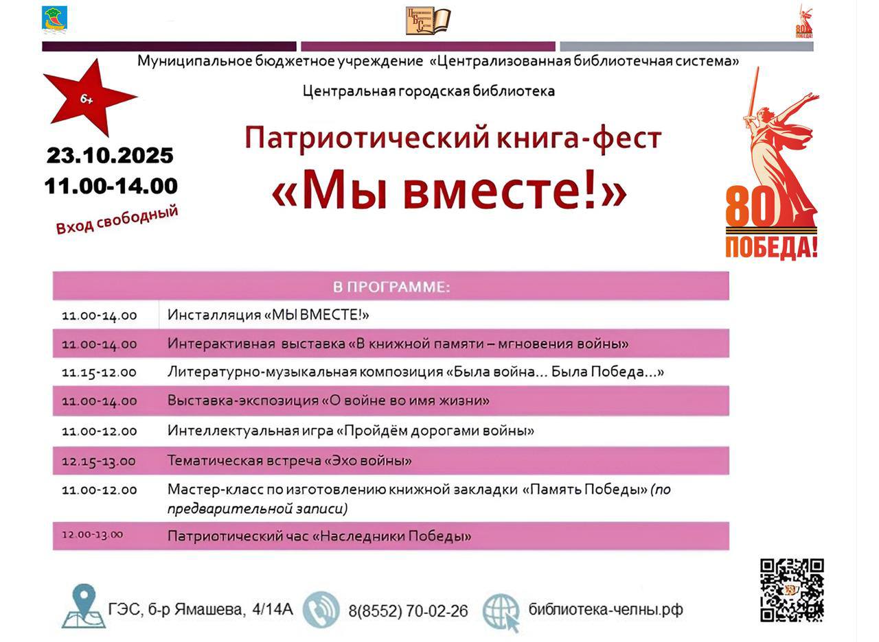 Приглашаем челнинцев на патриотический книжный фестиваль «Мы вместе!», приуроченный к году Защитника Отечества и 80-летию Победы в Великой Отечественной войне.