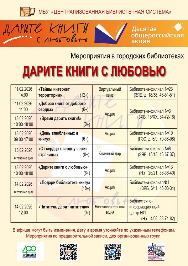 С 9 по 15 февраля 2026 года состоится Десятая общероссийская акция «Дарите книги с любовью», приуроченная к Международному дню книгодарения, который отмечается 14 февраля. С 2017 года эта акция ежегодно объединяет усилия Российской государственной детской библиотеки и Ассоциации «Растим читателя» при поддержке Министерства культуры России, Российского книжного союза и Ассоциации книгораспространителей.