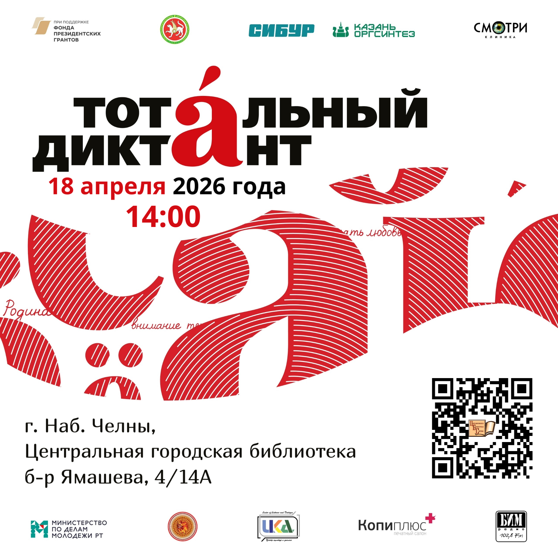 18 апреля в 14:00 библиотеки Набережных Челнов приглашают на «Тотальный диктант — 2026». Акция пройдет на двух площадках: Центральная городская библиотека и Центральная детская библиотека.