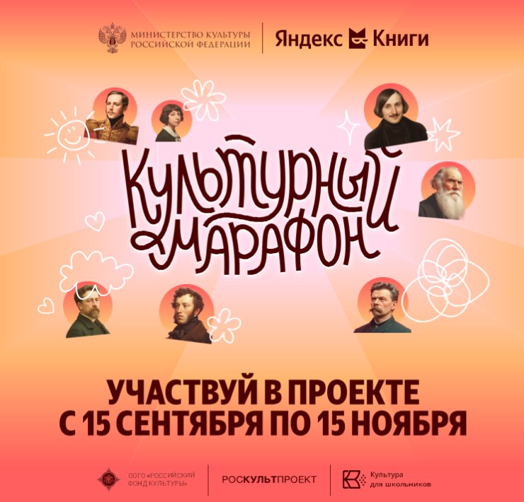 Министерство культуры Российской Федерации совместно с  компанией «Яндекс» и сервисом «Яндекс Книги» запускает очередной «Культурный марафон»,  который  поможет  школьникам  по-новому  взглянуть на великие произведения русской и мировой литературы.