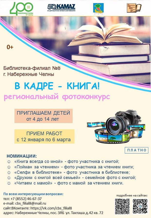 С 12 января по 6 марта 2026 года МБУ «Централизованная библиотечная система» г. Набережные Челны, приглашает детей от 4 до 14 лет включительно принять участие  в региональном фотоконкурсе  «В кадре – книга!».