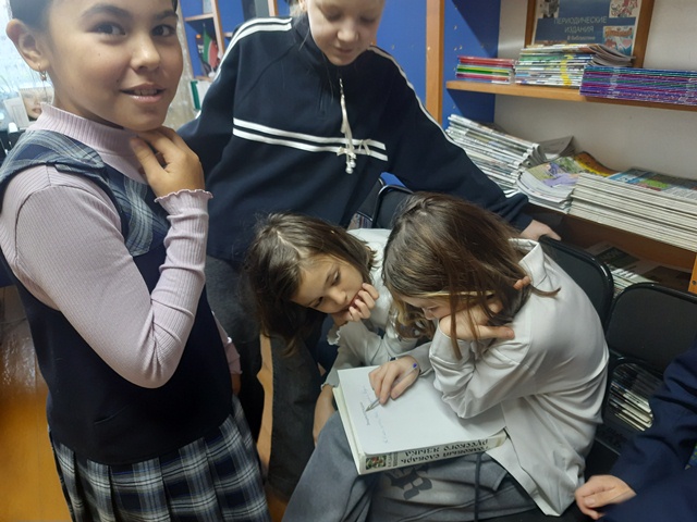 Балалар китапханәдә булган сүзлекләр белән танышты, аларны дөрес кулланырга өйоәнде. Укучылар аларның ике төп типка: энциклопедик һәм тел сүзлекләренә бүленүе турында белде. Чара барышында укучылар «Сүзлек белән бергә», «Белемлеләр», «Мөхәррир», «Мәгънәсен табарга» кебек кызыклы бәйгеләрдә катнашты. Монда балалар үзләренең рус теле сүзлекләре белән эшләү күнекмәләрен күрсәтә алды.