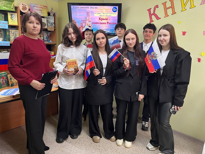 Әлеге мөһим вакыйга кысаларында 23 нче санлы китапханә 8 нче сыйныф укучылары өчен «Кырым – Россиянең бер тамчысы» дигән гражданлык диалогы уздырды.
