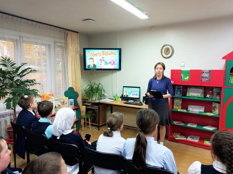 Шулай ук балалар шагыйрьнең төсле рәсемле электрон презентация рәвешендә тәкъдим ителгән табышмакларын чиште; өзекләр буенча Маршак әсәрләрен таныды; экранда иллюстрацияләр буенча әкиятләрне танып белде.