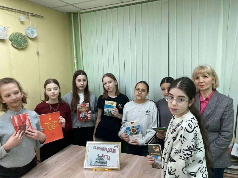 Особое внимание уделили примерам самоотверженности: защите «Дома Павлова», подвигам снайперов, также воинов, не отступивших ни на шаг. Участники узнали о мемориальном комплексе на Мамаевом кургане, увековечившим подвиг героев. Ребята прочитали стихи о войне и ответили на вопросы викторины. К мероприятию была представлена историческая, художественная литература, в том числе роман писателя – фронтовика Юрия Бондарева «Горячий снег».