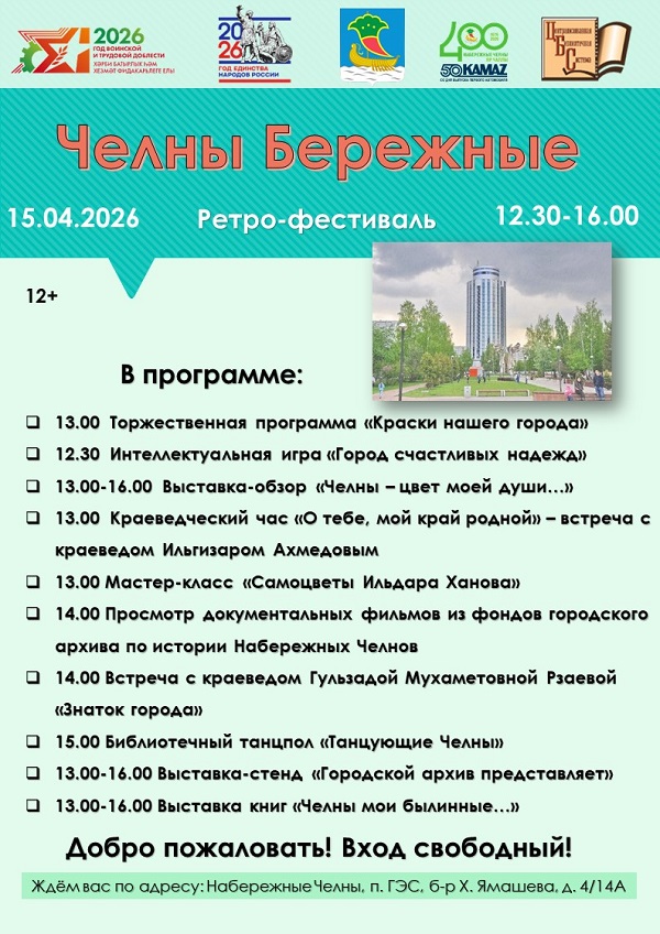 15 апреля в Центральной городской библиотеке состоится краеведческий ретро-фестиваль «Челны Бережные». Мероприятие посвящено городу Набережные Челны. Гости фестиваля смогут окунуться в историю города, познакомиться с историческими документами, встретиться с краеведами и знатоками города, услышать песни и стихи о родном городе.